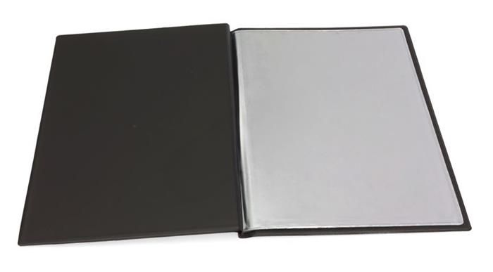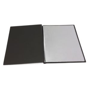 Katalógová kniha na prezentáciu materiálov formátu A4, (vkladanie zhora). - kniha obsahuje 20 transparentných PP obalov (0,04 mm) na vloženie dokumentov A4- hrúbka obalu 0,75 mm s papierovou etiketou na chrbtovej strane