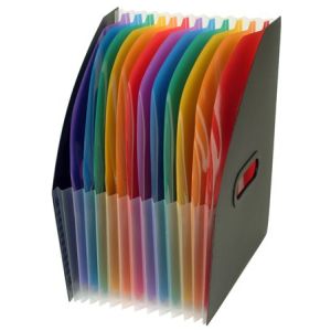 vhodný na ukladanie dokumentov formátu A4, pružný a odolný polypropylénový materiál, zvonka čierny povrch,zvnútra farebné priehradky, 2 rúčky