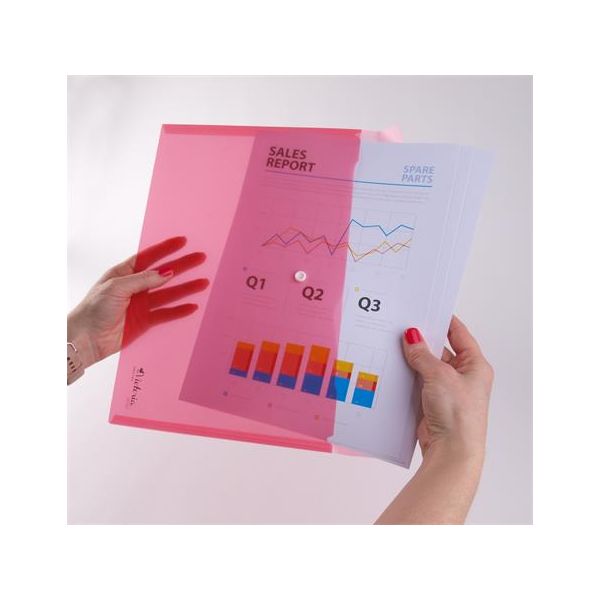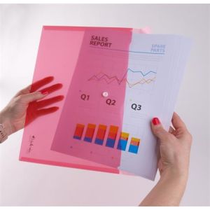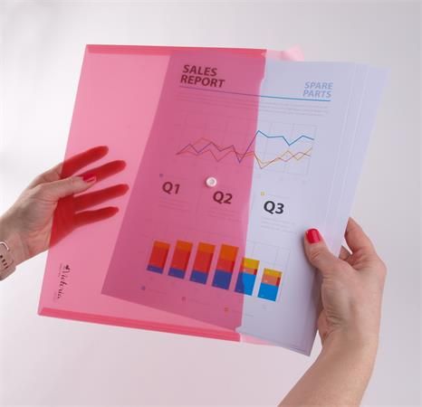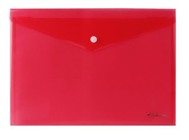 Obal na dokumenty A6 so zapínaním na patentku, vyrobený z kvalitného priehľadného PP materiálu. Farba: červená.