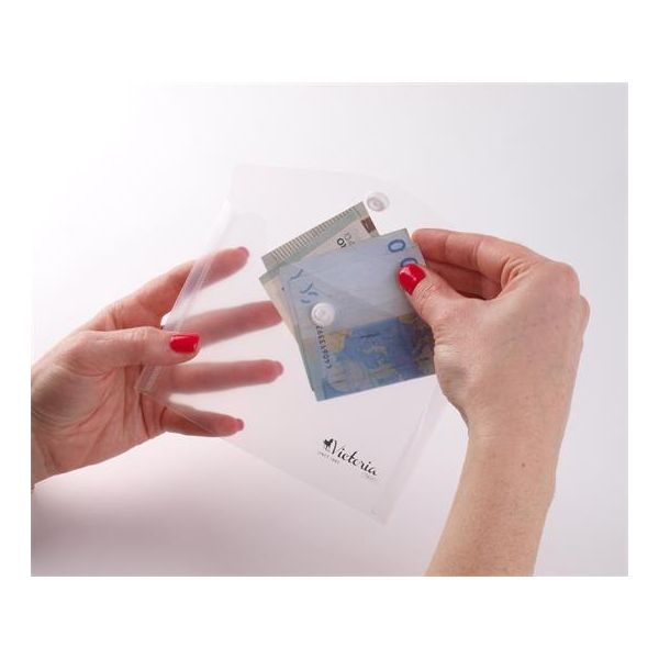 Obal na dokumenty A6 so zapínaním na patentku, vyrobený z kvalitného priehľadného PP materiálu. Farba: transparentná.