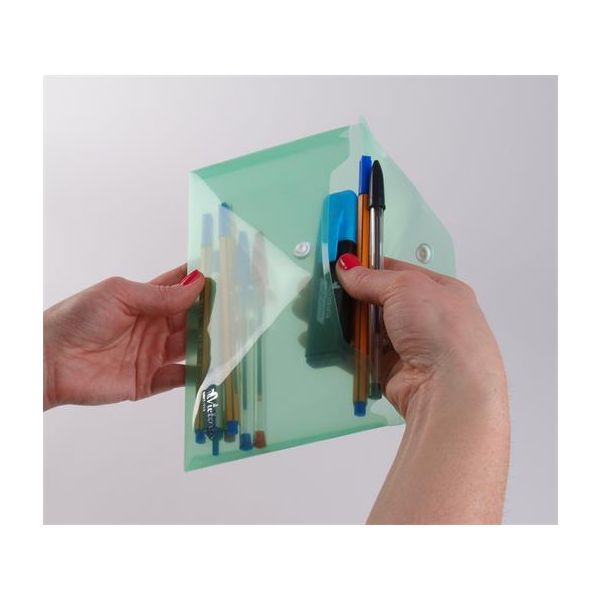 Obal na dokumenty A6 so zapínaním na patentku, vyrobený z kvalitného priehľadného PP materiálu. Farba: zelená.
