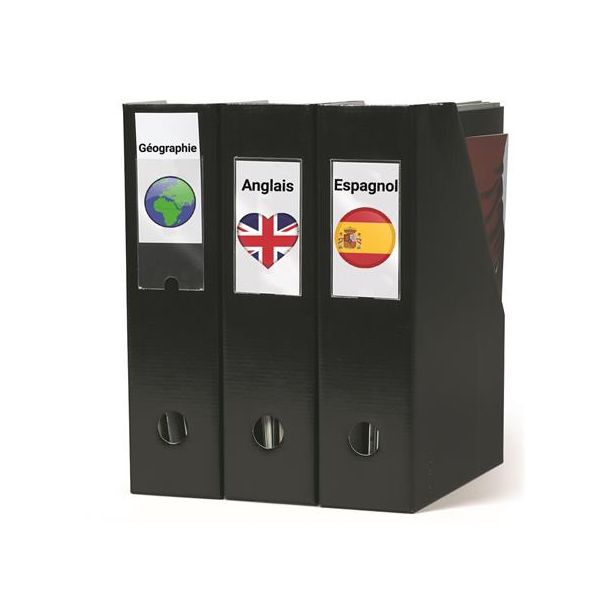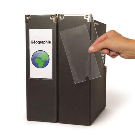 Vrecká vhodné na popis zakladačov, krúžkových blokov, priehradok a pod. Výrez na vrecku uľahčuje manipuláciu s vloženým popisným štítkom. Obsahom balení sú čisté zasúvacie štítky.Rozmery: 18 x 75 mmBalenie: 10 ks