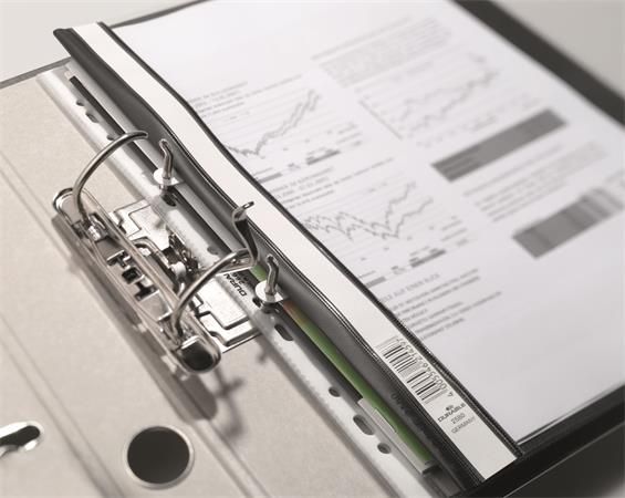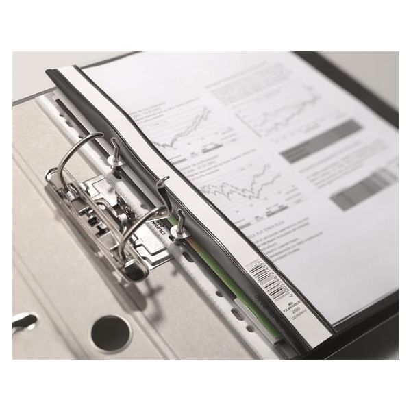Pevný PVC rýchloviazač, priehľadná predná strana, s odnímateľným úchopom na dokumenty (80 mm dierovanie). Môže sa vložiť do extra širokých krúžkových šanónov a pákových šanónov. Možnosť popisovania chrbtových štítkov.