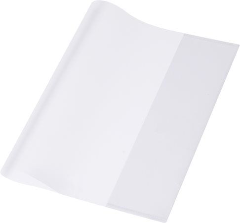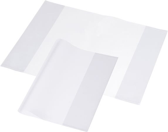 Transparentný obal na zošit A5, z pevného PVC, so zrnitou štruktúrou, so zaoblenými rohmi.