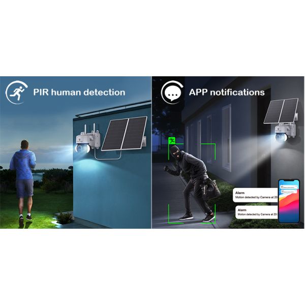 Otočný motorizovaný objektív · ochrana IP66 · IR aj farebné nočné videnie až 30m · typ pripojenia 4G · TF/SD card úložisko · Cloud úložisko · Full HD 1080P rozlišení, výkon solárneho panelu 20W max. · kapacita batérie 20000 mAh aplikáciu