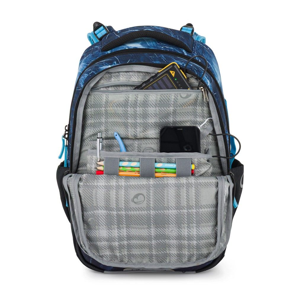 - Hlavná komora je spracovaná tak, aby sa do nej pohodlne vošli školské dosky, zošity veľkosti A4 alebo ťažšie učebnice.