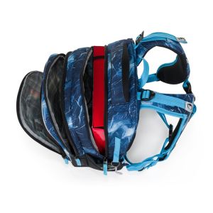 - Súčasťou chrbtového systému je ľahký, vyberateľný bedrový pás, konštrukčne zhotovený z priedušnej sieťoviny opatrený navyše reflexnými prvkami.