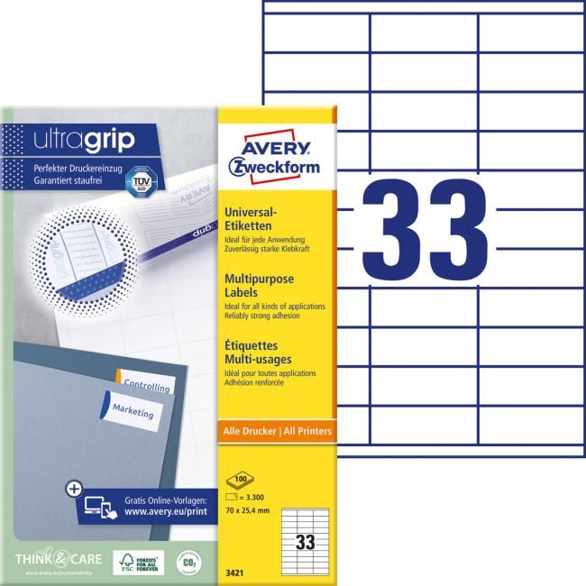 Biele univerzálne etikety vhodné na každodenné použitie v atramentových a laserových tlačiarňach a kopírovacích strojoch. Vďaka inovatívnej technológie ultragrip sa môžete spoľahnúť na bezchybné natiahnutie archu a tlač bez zasekávania. Bezpečnostný okraj QCT zabraňuje zanášaniu tlačiarne lepidlom. Pre laserové tlačiarne testované a certifi kované TÜV SÜD. Vysoká lepivosť na rôznych povrchoch. Ostrá tlač bez bez rozmazávania. Etikety sú vyrobené spôsobom šetrným k životnému prostrediu, majú certifi káciu FSC®, sú bielené bez použitia chlóru. Šablóny a softvér pre jednoduchú a rýchlu tlač etikiet k dispozícii zdarma. U niektorých rozmerov systém QuickPEEL™ na rýchlejšie odlepenie etikiet. Formát A4. Balenie 100 hárkov. Farba biela.