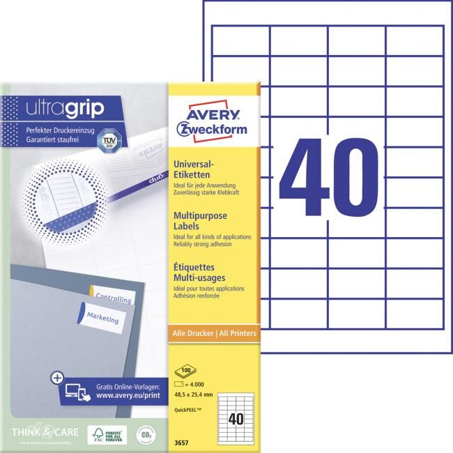 Biele univerzálne etikety vhodné na každodenné použitie v atramentových a laserových tlačiarňach a kopírovacích strojoch. Vďaka inovatívnej technológie ultragrip sa môžete spoľahnúť na bezchybné natiahnutie archu a tlač bez zasekávania. Bezpečnostný okraj QCT zabraňuje zanášaniu tlačiarne lepidlom. Pre laserové tlačiarne testované a certifi kované TÜV SÜD. Vysoká lepivosť na rôznych povrchoch. Ostrá tlač bez bez rozmazávania. Etikety sú vyrobené spôsobom šetrným k životnému prostrediu, majú certifi káciu FSC®, sú bielené bez použitia chlóru. Šablóny a softvér pre jednoduchú a rýchlu tlač etikiet k dispozícii zdarma. U niektorých rozmerov systém QuickPEEL™ na rýchlejšie odlepenie etikiet. Formát A4. Balenie 100 hárkov. Farba biela.