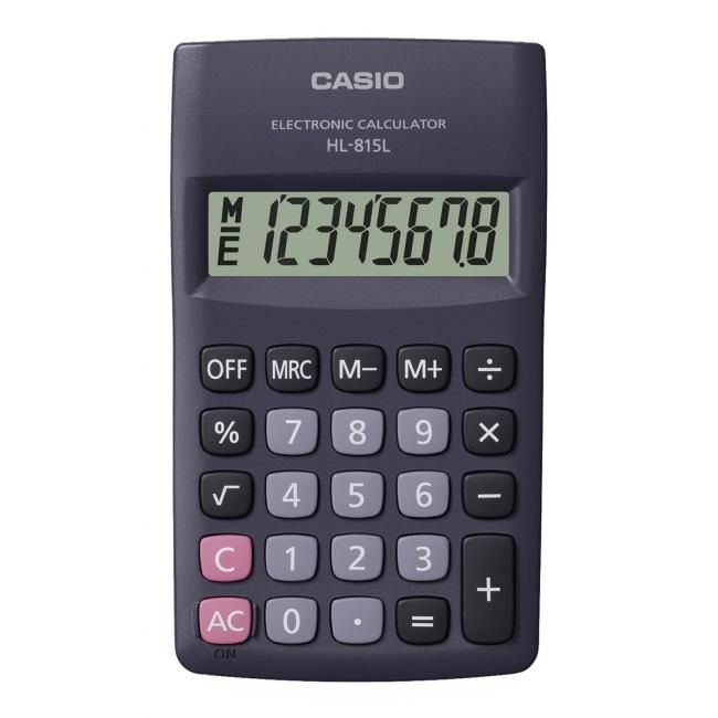 Malá vrecková kalkulačka s veľkým 8-miestnym LCD displejom a tlačidlami z tvrdej gumy.