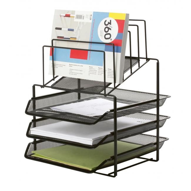 Stojan s tromi zásuvkami, vybavený dodatočným miestom pre katalógy, letáky alebo listy (5 priehradiek). Rozmery (š × v × h) 300 × 350 × 420 mm. Farba čierna.