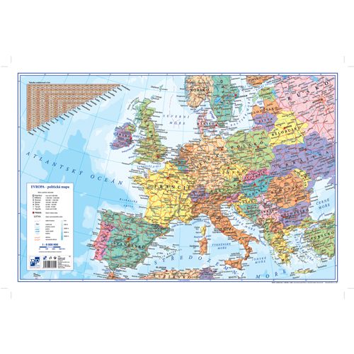 Mapa Európy pod zataveným transparentným obalom z PVC fólie. Postranné klopy na založenie odkazov a poznámok. Text v českej verzii.