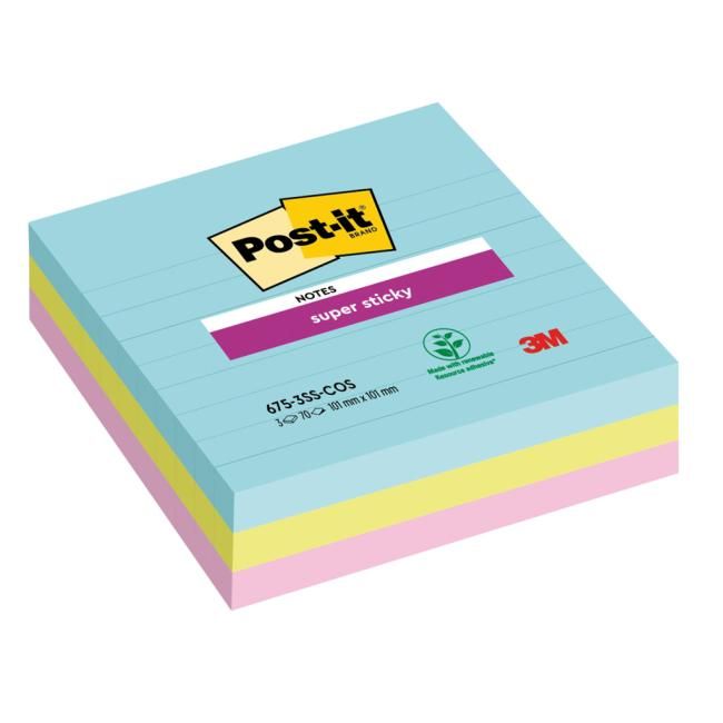 Bločky Post-it® Super Sticky™ so špeciálnym lepidlom, vďaka ktorému držia aj na nerovnom povrchu. Po odlepení nezanechávajú stopy po lepidle. Mix farieb. Rozmery 101 x 101 mm. Počet lístkov 3 x 70.