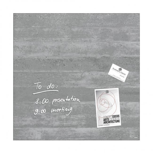 Magnetické tabule z tepelne tvrdeného bezpečnostného skla (EN 12150-1) hrúbky 15 mm s jednoduchou a bezpečnou montážou s certifi kátom TUV dodajú vašim kanceláriám, konferenčným miestnostiam, jedálňam i domácnostiam exkluzívny vzhľad. Sú popisovateľné kriedovými popisovačmi Sigel a za sucha zotierateľné utierkou z mikrovákna. Súčasťou balenia sú 3 super silné neodymové magnety a montážny materiál. Pri používaní príslušenstva Sigel je garantovaná 25-ročná záruka na magnetický sklenený povrch tabule. Rozmery 48 × 48 cm. Dizajn podhľadový betón.
