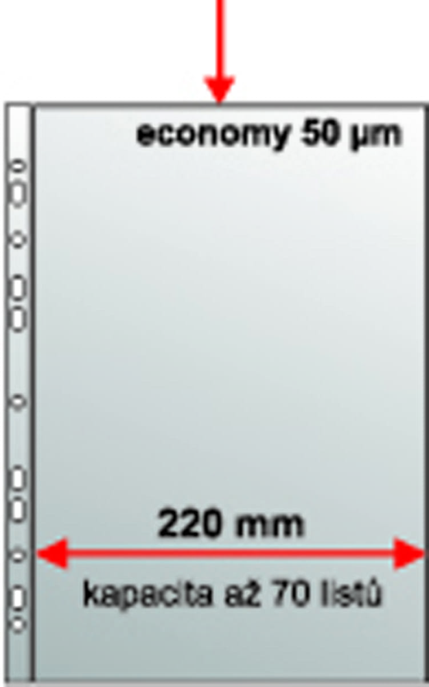 Obal s eurodierovaním vhodný na zakladanie materiálov rozšíreného formátu A4. Povrch matný, otvor zhora. Hrúbka 50 mic. Vnútorné rozmery obalu 305 × 220 mm. Balenie 50 ks v PE sáčku.