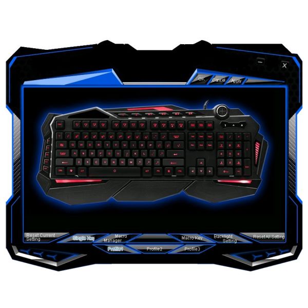 3 profily - na klávesnici nájdete klávesy pre prepínanie medzi 3 nezávislými profilmi. Pre každý profil je možné individuálne nastaviť farba podsvietenia, jej intenzita, makra, preddefinované klávesy...