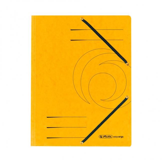 Obal A4 s tromi chlopňami a dvomi gumičkami čiernej farby. Materiál prešpánový kartón gramáže 355 g / m². Väčšie balenie 25 ks. Farba žltá.
