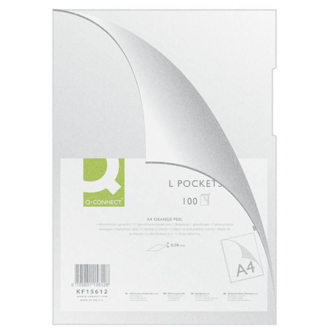 Priehľadný obal na dokumenty z polypropylénu. Otvor zhora a po dlhšej strane („L“). Povrch matný, mierne pórovitý, výkroj na ľahšiu manipuláciu. Formát A4. Hrúbka 80 mikrónov. Balenie 100 kusov.
