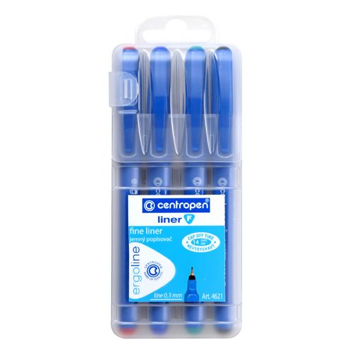 Jednorazový liner. Vláknový hrot v kovovej objímke, telo linera vo farbe atramentu. Ventilačný uzáver vo farbe atramentu so šesťhranným hrotom. Atrament na vodnej báze, odolný voči vysychaniu, bez zápachu, netoxický.dĺžka písacej linky: 500-600mpísacia čiara: 0,4 mmhrot: 0,4 mmdodáva sa v 4 farbách (čierna, červená, modrá, zelená) v balení 10 kusov v jednej farbeideálne na vytváranie farebných poznámok, prácu so šablónou atď.pre použitie v kancelárii, škole aj domácnosti
