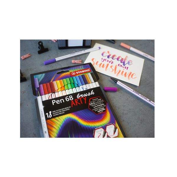 So STABILO Pen 68 brush dokonale ovládnete svoje ťahy fixou, takže môžete ľahko nakresliť krásne línie a vytvoriť skvelé texty v štýle letteringu, ktoré sú teraz fascinujúcim trendom.S novým flexibilným hrotom je táto fixa ďalším prírastkom do rodiny Pen 68 brush, ktorý je vhodný pre začiatočníkov i pokročilých umelcov. Reguláciou tlaku na špičku fixy môžete pomocou "štetcového" hrotu vytvoriť silné alebo tenké línie. Sada 18 ks. Vďaka náplni na vodnej báze môžete docieliť ďalšie skvelé efekty: napríklad tieňovanie, miešanie jednotlivých odtieňov alebo použiť fixu ako akvarel. Rozmanité využitie dodá Vašim do-it-yourself projektom a vlastnému designu celkom nový rozmer. Brilantné a zaujímavé kresby sa vyznačujú sýtymi farbami na ktoré budete pyšní! POZOR! Nie je vhodné pre deti do 36 mesiacov kvôli malým častiam, ktoré môžu byť prehltnuté.