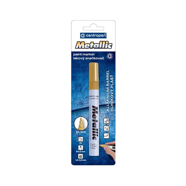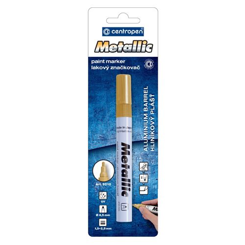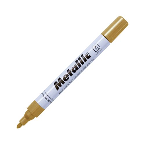 Univerzálny lakový popisovač s hliníkovým telom píše na porézne i neporézne povrchy. Svetlostály atrament po zaschnutí odolá vode, poveternostným vplyvom aj oderu. Hrot okrúhly, šírka stopy 1,5 - 2,5 mm. Väčšie balenie 10 ks v jednej farbe. Farba zlatá.