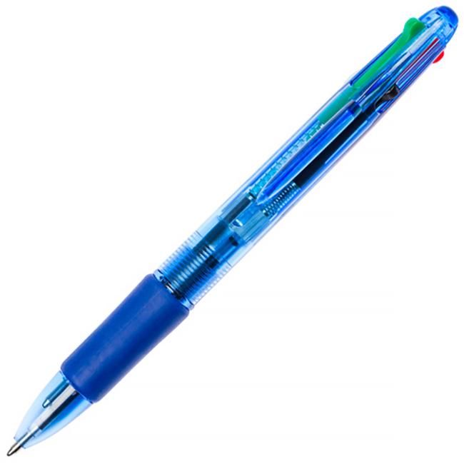 Jednorazové 4‑farebné pero so stláčacím mechanizmom a klipom s gumenou úchytovou zónou.