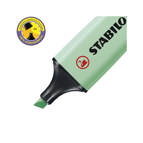 Jedinečný zvýrazňovač v 6 nových pastelových odtieňoch. V 2 šírkach stopy. Vhodný pre prácu s papierom, kópiami a faxom. Vydrží až 4 hodiny bez vrchnáčika a nevyschne. Značková kvalita od vynálezcu zvýrazňovača - BOSS Original je na trhu už od roku 1971. Nezameniteľný tvar zvýrazňovača, ktorý je možné použiť kdekoľvek. Farba mätová.