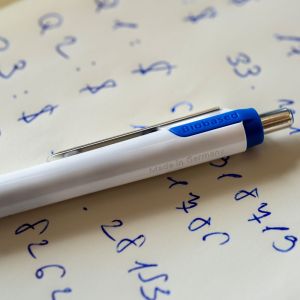 Jednorazové pero s priehľadným čírym telom modrej farby a tvarovaným vrubkovaným úchopom. Šírka stopy 0,7 mm.