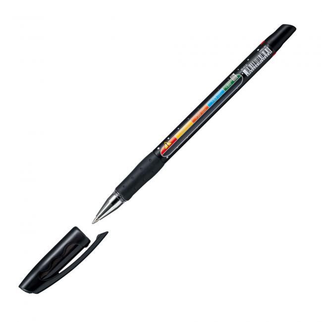 Plastové guľôčkové pero s priehľadom s ukazovateľom hladiny zostávajúceho atramentu, resp. počtu strán, ktoré je možné ešte napísať. Vhodné najmä pre školákov a študentov pri skúškach a testoch. Elastická úchytová zóna pre uvoľnené držanie, ľahko tečúci atrament pre rýchle a čisté písmo. Šírka stopy 0,45 mm. Väčšie balenie 10 ks.