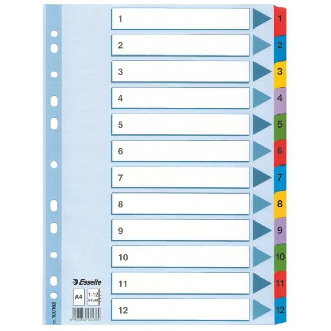 Celofarebný rozraďovač Esselte vyrobený z kartónu v rôznych farbách. Formát A4, eurodierovanie, popisovateľný titulný list na jasnú identifikáciu obsahu. Balenie jedna sada v polyesterovom sáčku. Väčšie balenie 20 sád.Formát: A4Popis: s titulným listom