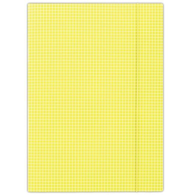 Kartonový obal vyrobený z lepenky s hmotnosťou 400g. Jednostranne potiahnutý vysoko lesklým tlačovým lakom, okrúhla vertikálna guma vo farbe obalu chráni obsah pred vykĺznutím. Károvaná potač. Formát: A4. Farba žltá. Rozmery 232 x 317 mm.