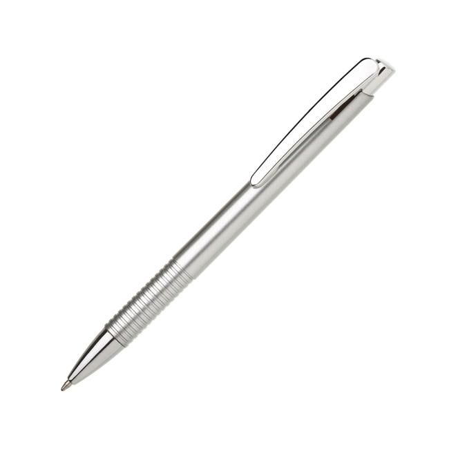 Guľôčkové pero plastové LASTI s vrúbkovaným úchopom a doplnkami v striebornej farbe. Modrá náplň X-20. Farba strieborná.