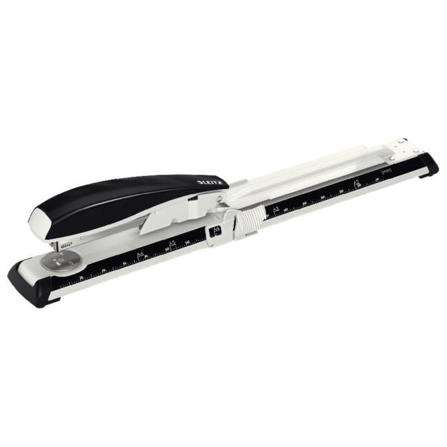 Kvalitná výkonná zošívačka na zošívanie veľkých formátov a zošívanie uprostred dokumentu, napr. brožúr. Patentovaná zošívacia technológia DIT na vždy spoľahlivé zošitie. Najlepšie výsledky dosiahnete v kombinácii s drôtikmi Leitz Power Performance P3 (24/6, 26/6) alebo P4 (24/8, 26/8). Kapacita zošívania: 40 hárkov (80 g/m2). Doraz nastaviteľný na formáty A2 až A6, medzinárodné formáty US-Norma a Foolscap. Hĺbka vkladania až 300 mm. Otočná nákovka na zmenu typu zošívania - otvorené a uzavreté zošívanie, otvorením ramena o 180° je možné aj zošívanie nástenkové. Kapacita zošívania: 40 hárkov (80 g/m2). Farba čierna.