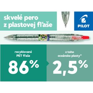 Guľôčkové klikacie pero Pilot Eco Ball B2P. Klasika od renomovanej firmy Pilot. Vyrobený z 86,64% recyklovaných plastových fliaš, z ktorých 2,5% sú recyklované oceánske plasty. Toto stláčacie guľôčkové pero s vymeniteľnou náplňou ponúka skutočné pohodlie pri písaní vďaka atramentu s olejovou zložkou, ktorá umožňuje hladké kĺzanie pera po papieri. Guľôčka 0,5 mm. Šírka stopy: 0,27 mm. Farba červená.