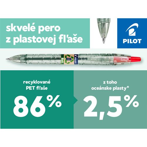 Guľôčkové klikacie pero Pilot Eco Ball B2P. Klasika od renomovanej firmy Pilot. Vyrobený z 86,64% recyklovaných plastových fliaš, z ktorých 2,5% sú recyklované oceánske plasty. Toto stláčacie guľôčkové pero s vymeniteľnou náplňou ponúka skutočné pohodlie pri písaní vďaka atramentu s olejovou zložkou, ktorá umožňuje hladké kĺzanie pera po papieri. Guľôčka 0,5 mm. Šírka stopy: 0,27 mm. Farba modrá.