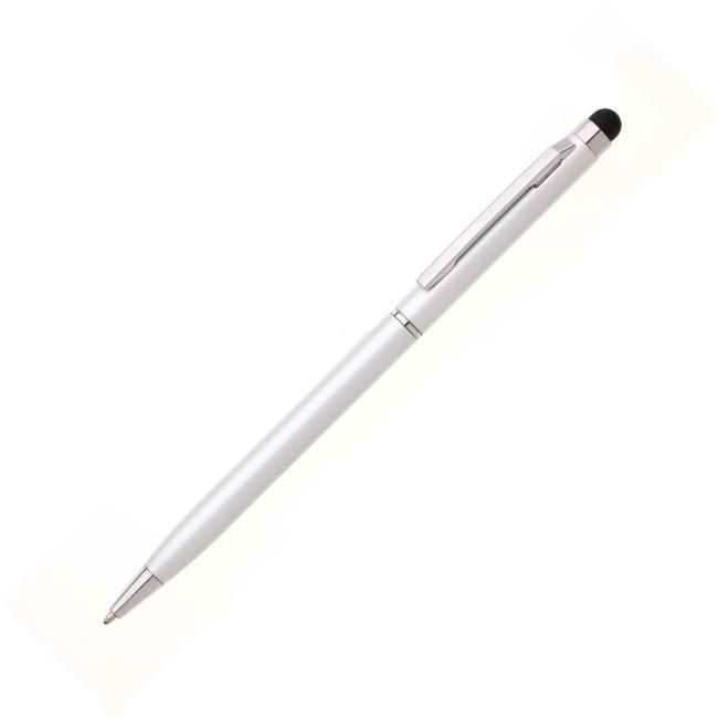 Tenké kovové guľôčkové pero s otočným mechanizmom a hrotom pre ovládanie dotykovej obrazovky. Strieborné chrómové doplnky, modrá náplň cross. Materiál hliník.