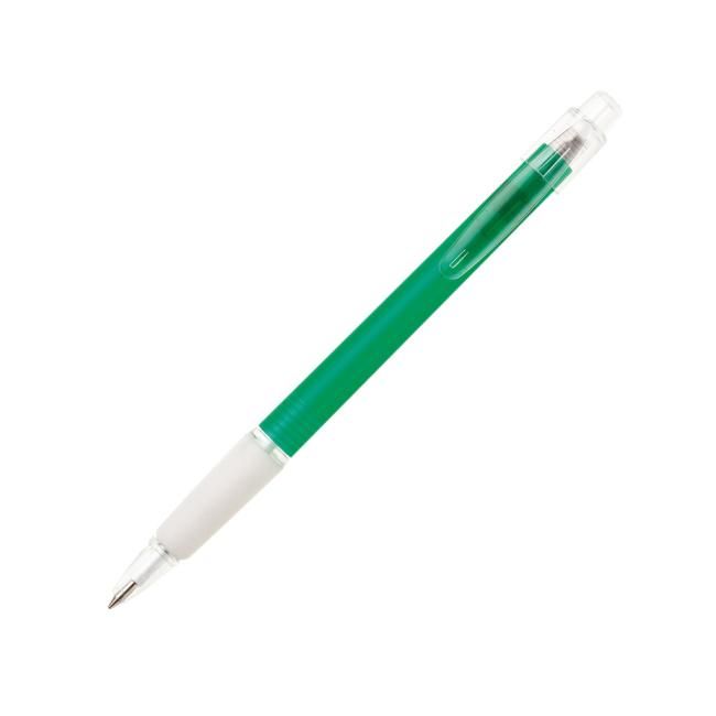 Guľôčkové pero plastové PROSTO s priehľadným farebným telom a pogumovaným úchopom . Modrá náplň X-20. Farba zelená.