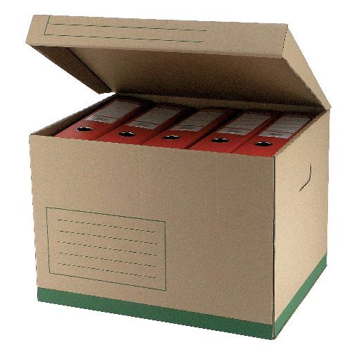 Škatuľa z hnedej vlnitej lepenky so sklápacím vekom a zelenou potlačou na ukladanie a archiváciu 5 zakladačov šírky 8 cm alebo archívnych boxov I/-75 mm. Rozmery (š x v x d) 425 x 330 x 300 mm. Nosnosť 100 Kg.