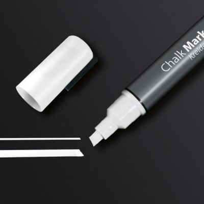 Ľahko stierateľné a vysoko nepriehľadné kriedové popisovače vhodné na sklenené tabule a všetky hladké povrchy podobné sklu. Zrezaný hrot hrúbky 1 - 5 mm. Vodeodolný atrament je zmazateľný vlhkou alebo suchou utierkou. Farba čierna.