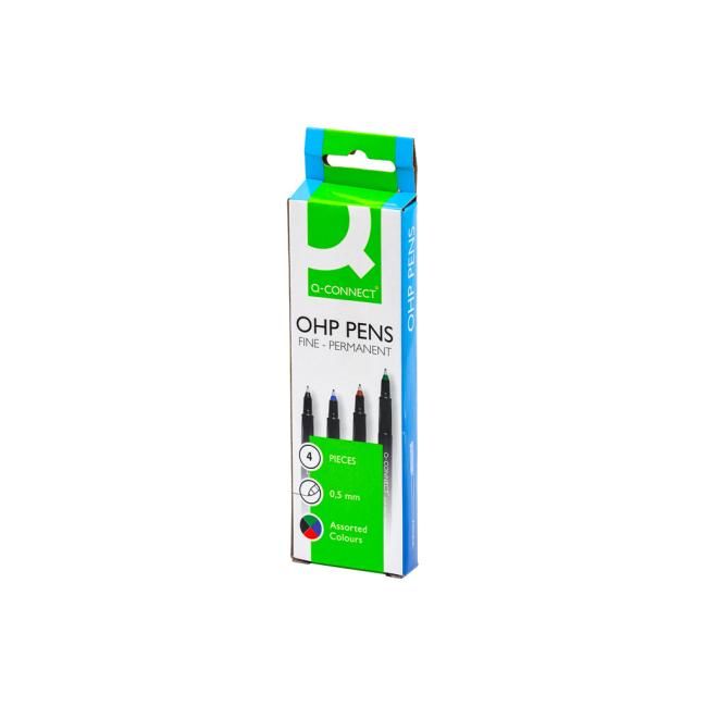Permanentný popisovač Q-Connect OHP, rýchloschnúci. Jemný plastový hrot s 0,5 mm šírkou písma permanentným atramentom. Sada 4 farieb.