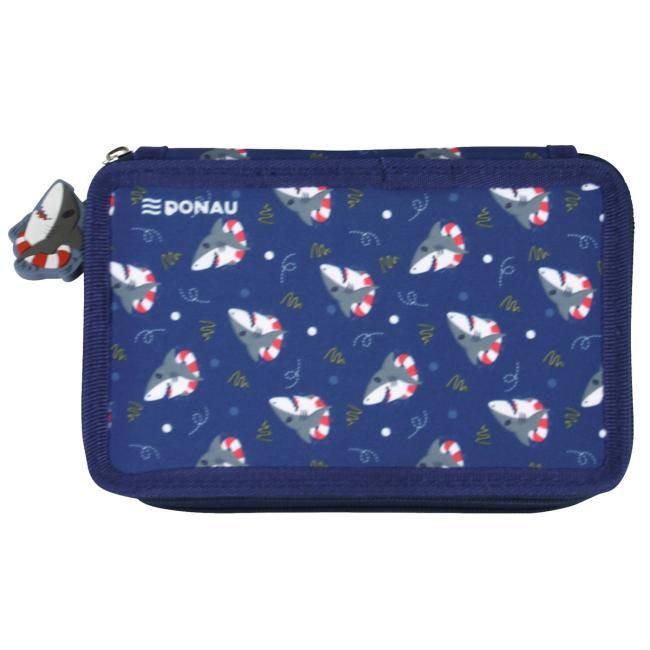 Plný peračník s 3 poschodiami, malým všitým vrecúškom, obsahuje 43 dielov: 1 guma, 1 strúhadlo, 3 ceruzky, 1 pravítko, 1 rozvrh hodín, 18 vláknitých pier, 18 farebných ceruziek. Materiál polyester, rozmery 200 × 60 × 130 mm.
