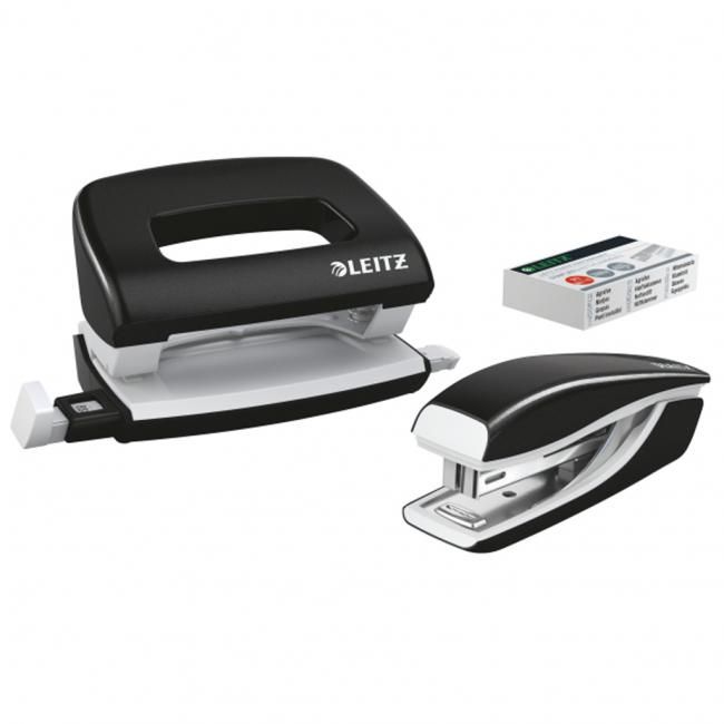 Minisúprava v moderných farbách. Malé a kompaktné rozmery. Kapacita 10 hárkov. Celokovová minizošívačka a dierovačka na použitie v kancelárii aj na cestách. Zošívačka s otvorením ramena o 180° na nástenkové zošívanie. Použite spinky Leitz Power Performance P2, č. 10, jedna škatuľka spiniek je súčasťou balenia. Dierovačka má príložník s kontrastnou potlačou jednotlivých formátov, rámček na jasné určenie formátu. Balenie v blistri. Farba čierna.