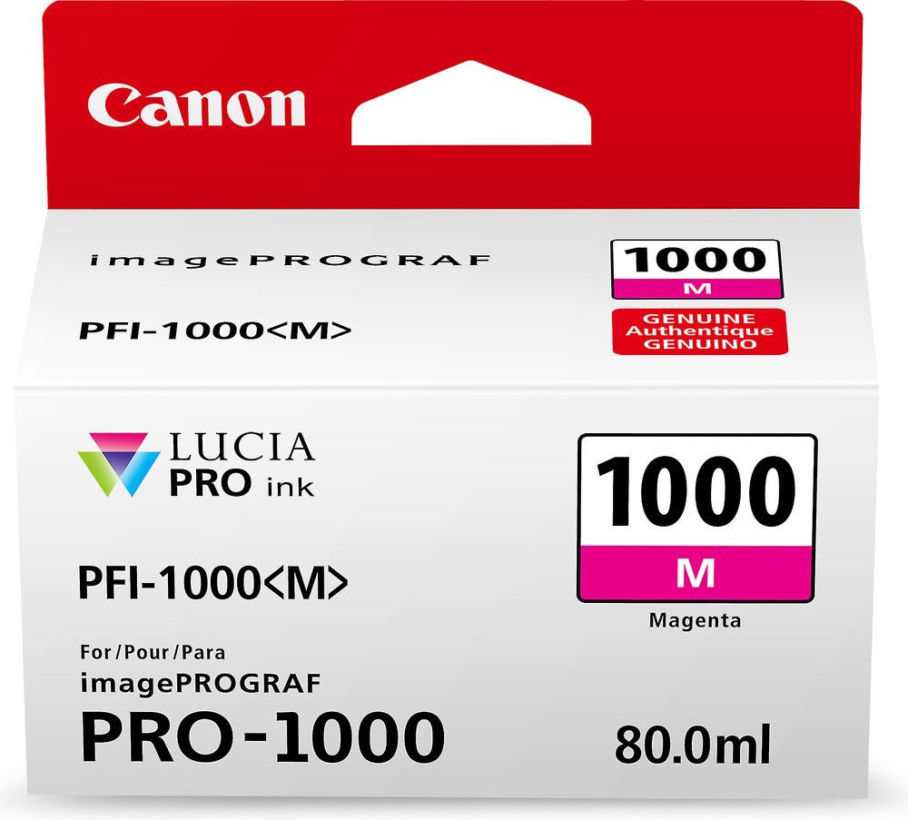 Originálna atramentová kazeta (cartridge) Canon PFI-1000M vo farbe purpurová (magenta). Jeho kapacita je 5885 strán. Cartridge od výrobcu Canon spĺňa medzinárodné štandardy, vďaka čomu je garantovaná vysoká kvalita tlače.