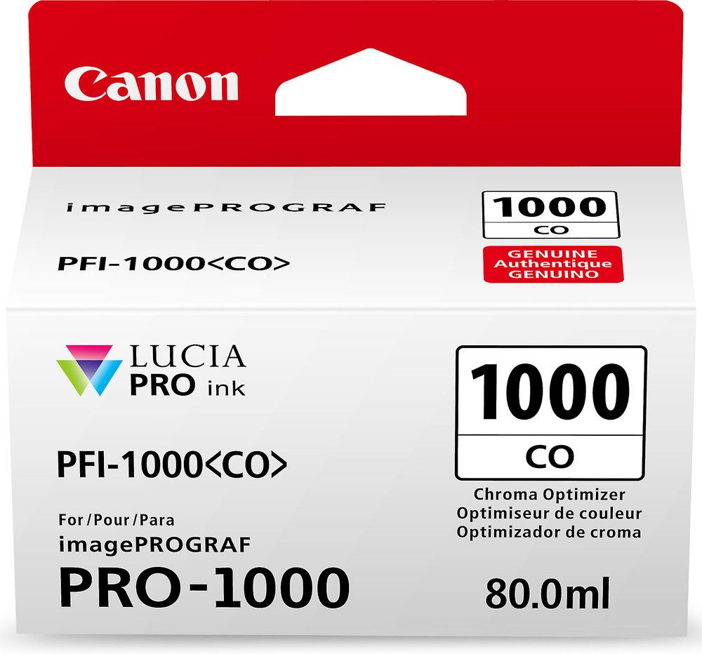 Originálna atramentová kazeta (cartridge) Canon PFI-1000CO vo farbe optimalizátor farieb (color optimalizer). Jeho kapacita je 680 strán. Cartridge od výrobcu Canon spĺňa medzinárodné štandardy, vďaka čomu je garantovaná vysoká kvalita tlače.