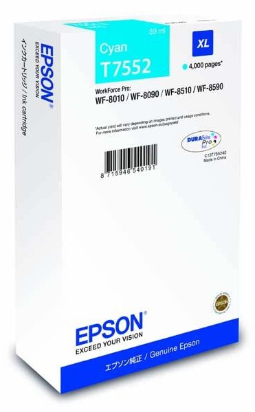 Originálna atramentová kazeta (cartridge) Epson T7552 XL vo farbe azúrová (cyan). Jeho kapacita je 4000 strán. Cartridge od výrobcu Epson spĺňa medzinárodné štandardy, vďaka čomu je garantovaná vysoká kvalita tlače.
