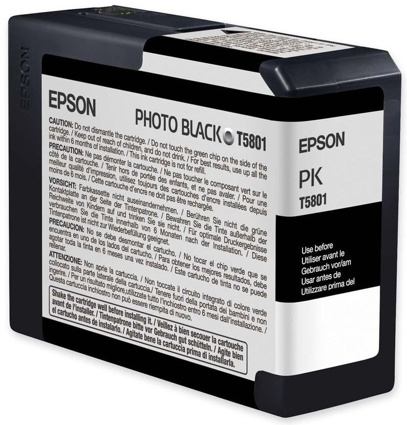 Originálna atramentová kazeta (cartridge) Epson T5801 vo farbe foto čierna (photo black). Jeho kapacita je strán. Cartridge od výrobcu Epson spĺňa medzinárodné štandardy, vďaka čomu je garantovaná vysoká kvalita tlače.