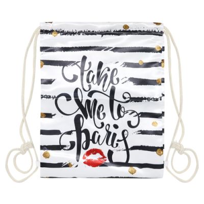 Textilné vrecko na prezuvky s lesklou potlačou “Take Me To Paris“ so zarážkami na oboch stranách. Vak je vhodný pre športové využitie aj bežné nosenie.