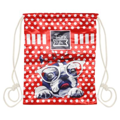 Textilné vrecko na prezuvky s farebnou potlačou na prednej strane, so zarážkami na zaťahovanie na oboch stranách. Materiál: Polyester. Rozmer: 40x32 cm.