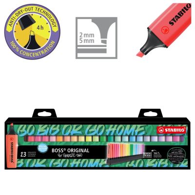 Sada obsahuje 9 neonových a 14 pastelových farieb (séria Snooze One Edition). Produkt STABILO BOSS ORIGINAL ponúka najvyššiu kvalitu spracovania, atramentu a pohodlia pri písaní. Technológia STABILO Anti-Dry-Out chráni štyri hodiny pred vysušením. Klinový hrot so šírkou stopy 2 až 5 mm.